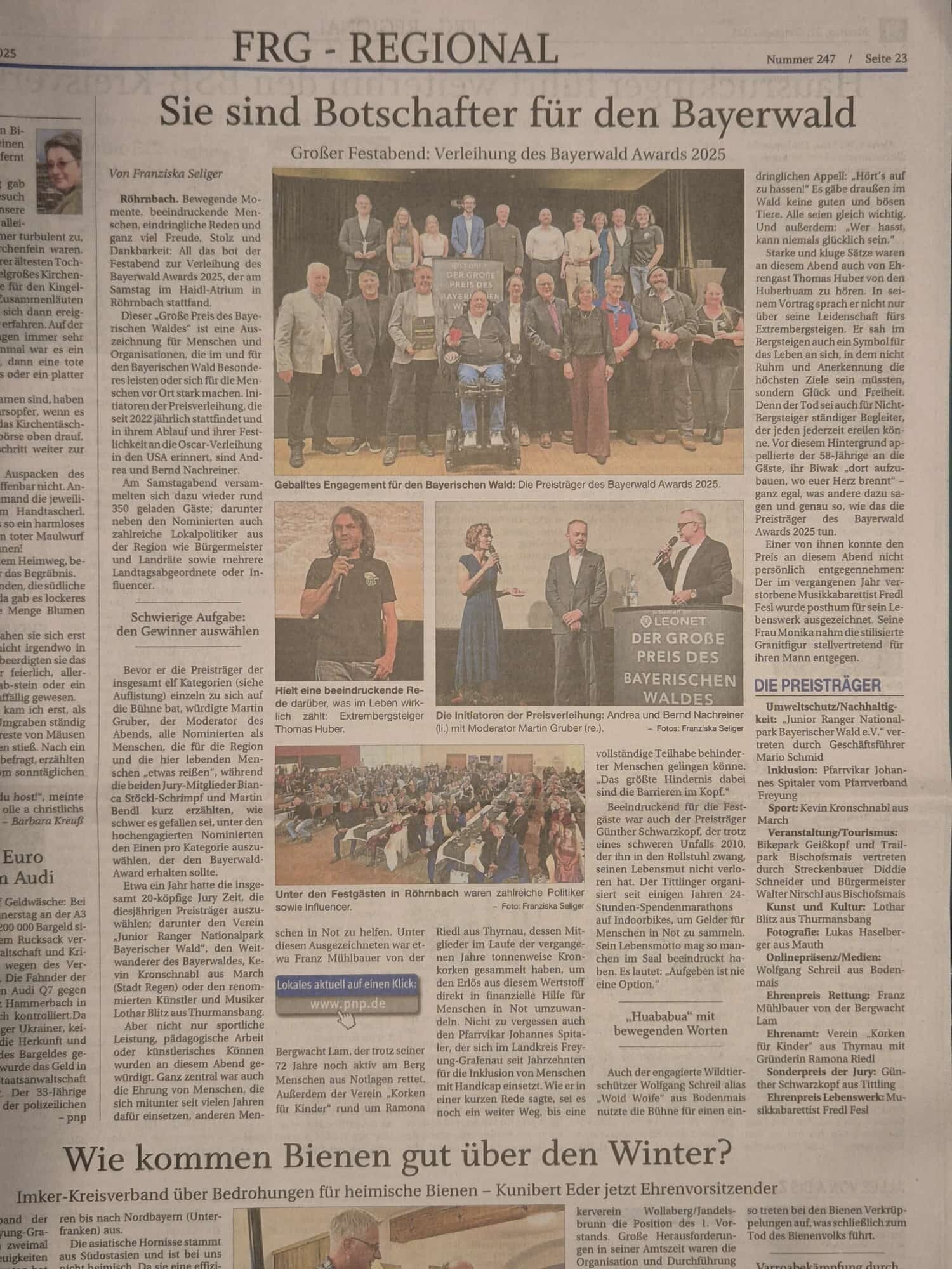 In Röhrnbach im Landkreis Freyung-Grafenau wurde am vergangenen Samstag (26.10.) der Bayerwald-Award verliehen.