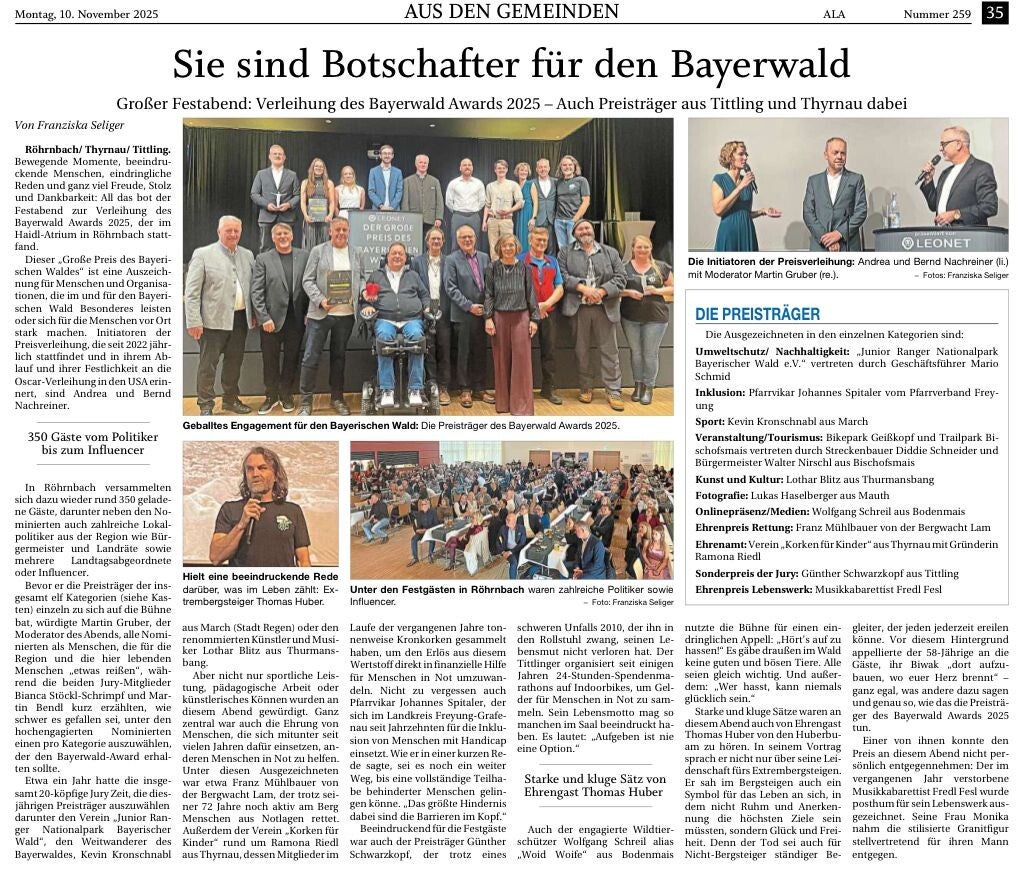"Dankeschön schlussendlich auch an Bernd Nachreiner, der diese Veranstaltung zur Verleihung des Bayerwald-Award ins Leben gerufen hat."